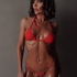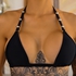 Яркий и дерзкий мини купальник отделан клепками, что придает ему еще более необычный и откровенный вид. Особое внимание также стоит обратить на необычный задник стрингов этого мини бикини